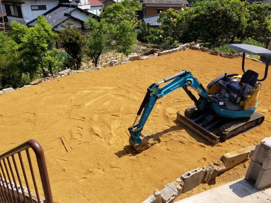 今回、コンクリートの撤去が完了した後に畑にするために農業用の綺麗な土を搬入し敷きならします。